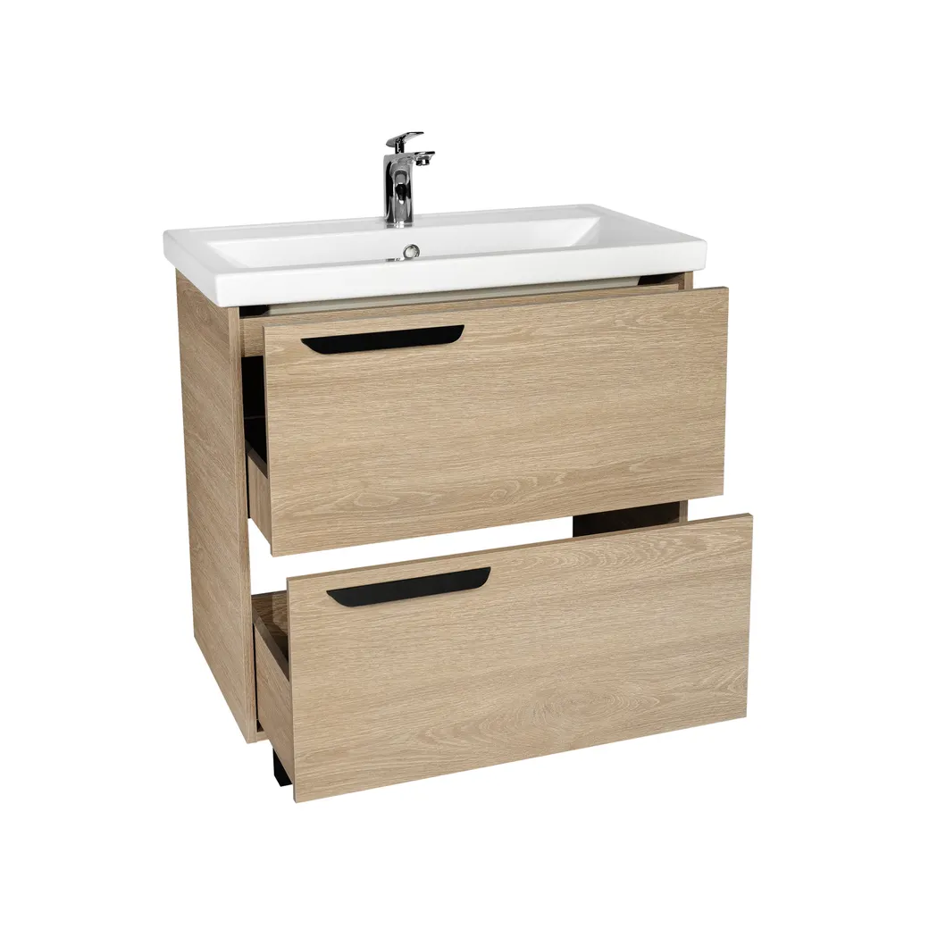 Тумба КЁЛЬН 80, напольная, 2 ящ., светлое дерево (под раковину ФОСТЕР 80), VIANT. Комплектация: корпус, 2 ручки черный металл, 2 ножки черные металл, 2 ножки черный пластик.