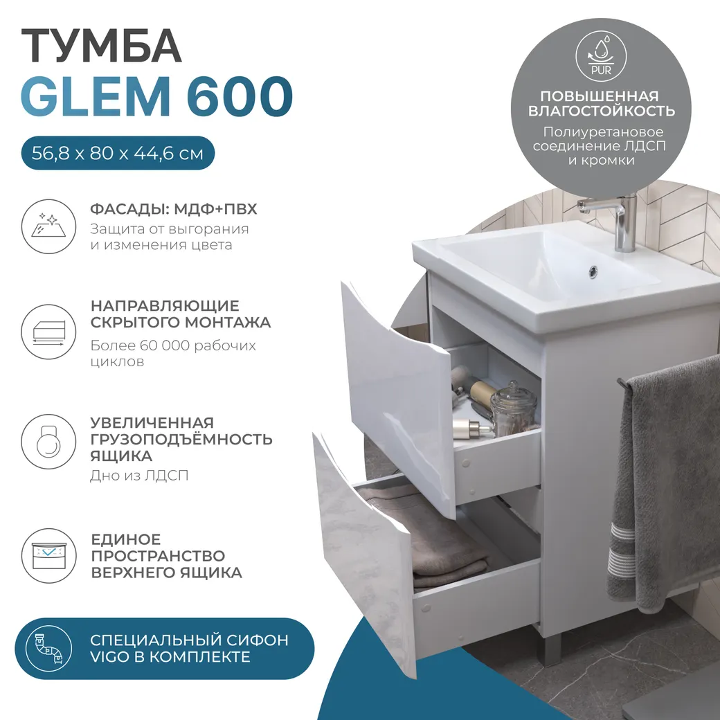 Тумба Glem 60, напольная, 2 ящ., белая (под ракоовину Como 60)