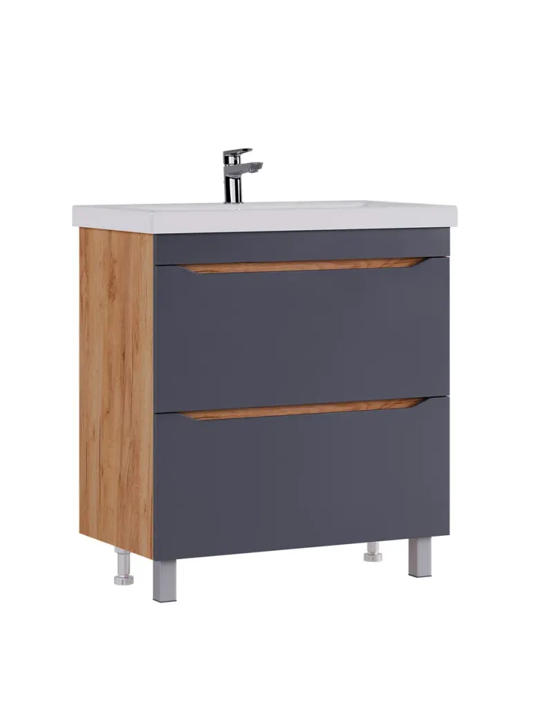 Тумба под раковину VIGO Wave 80 напольная 385 дуб золотой. Комплектация: корпус, 2 выдвижных ящика, выдвижной органайзер для мелочей, шариковые направляющие полного выдвижения, 2 опоры квадратные регулируемые, 2 кухонные опоры, сифон. Поставляется в разобранном виде. Сифон Vigo в комплекте..