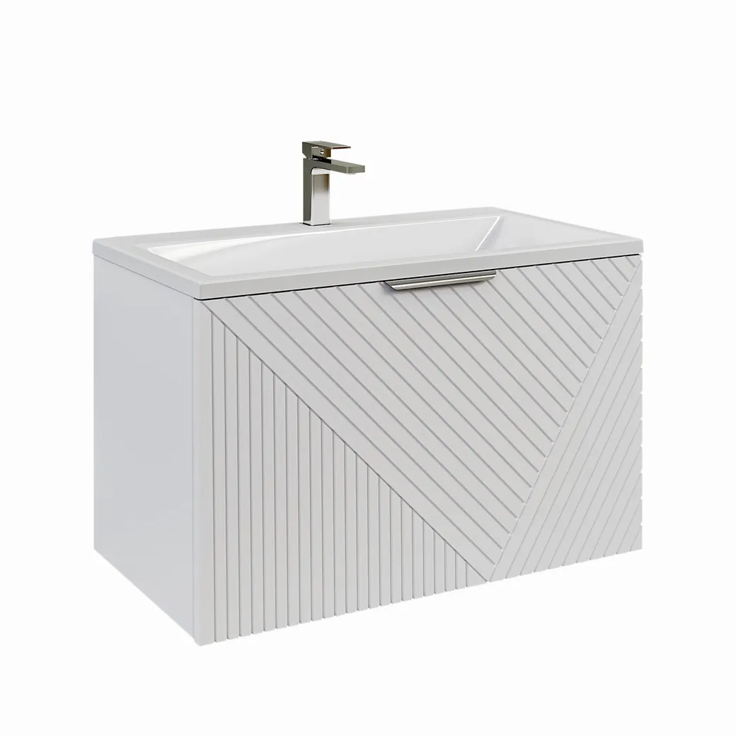 Тумба подвесная «БЛИСС» 70 см с 1 ящиком, белая матовая Элегантное решение для современной ванной комнаты — подвесная тумба «БЛИСС» 70 см идеально сочетает стиль, функциональность и надежность. Материалы: Корпус и фасады выполнены из влагостойкого МДФ, покрытого высококачественной матовой краской. Это гарантирует устойчивость к влаге и долговечность при ежедневном использовании в условиях повышенной влажности. Размеры: Ширина — 700 мм Глубина — 450 мм Высота — 400 мм Также доступна в размерах: 60, 80 и 100 см — для ванных комнат любого формата. Цветовые решения: • Белый матовый • Бежевый матовый • Графит матовый Функциональность: • Один вместительный выдвижной ящик с системой плавного закрывания • Органайзер внутри ящика — для удобного хранения косметики, аксессуаров и мелочей Дизайнерские детали: • Ручки в матовом хроме подчёркивают современный стиль и придают изделию изысканный вид • Подвесная конструкция облегчает уборку и визуально увеличивает пространство Устойчивость к влаге: Материалы, используемые в тумбе, обеспечивают повышенную влагостойкость, что особенно важно для использования в ванной комнате. Покрытие защищает от разбухания и деформации при попадании воды. Тумба комплектуется Раковиной "БЛИСС-70 см"(приобретается отдельно) Рекомендации по уходу: Протирать мягкой тканью, слегка смоченной водой или мягким мыльным раствором. Не использовать абразивные чистящие средства и губки. Гарантия: 2 года гарантии от производителя. Для кого подходит: Идеально для: • Современных семей, ценящих минимализм и порядок • Одиночек и молодых пар, оформляющих стильную ванную в компактном пространстве • Владельцев квартир-студий и небольших санузлов