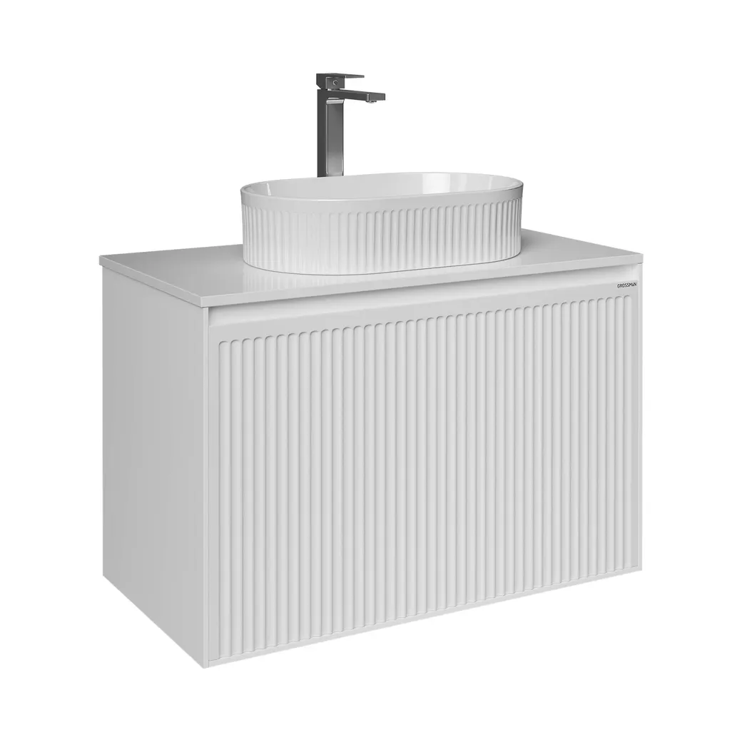 Подвесная тумба “КРИСТАЛЛ” 80 см с 1 ящиком, белый глянец — стильное и функциональное решение для современной ванной комнаты. Корпус и фасады выполнены из прочного МДФ, окрашенного в белый цвет с глянцевым эффектом. Элегантный фасад с вертикальным рифлением придаёт изделию изысканный внешний вид. Безручечный дизайн и скрытые направляющие с доводчиком обеспечивают комфортное и бесшумное использование. Тумба предназначена для настенного монтажа, в комплект входят надёжные подвесы для крепления. Столешница “КРИСТАЛЛ-80 см” из искусственного камня приобретается отдельно.