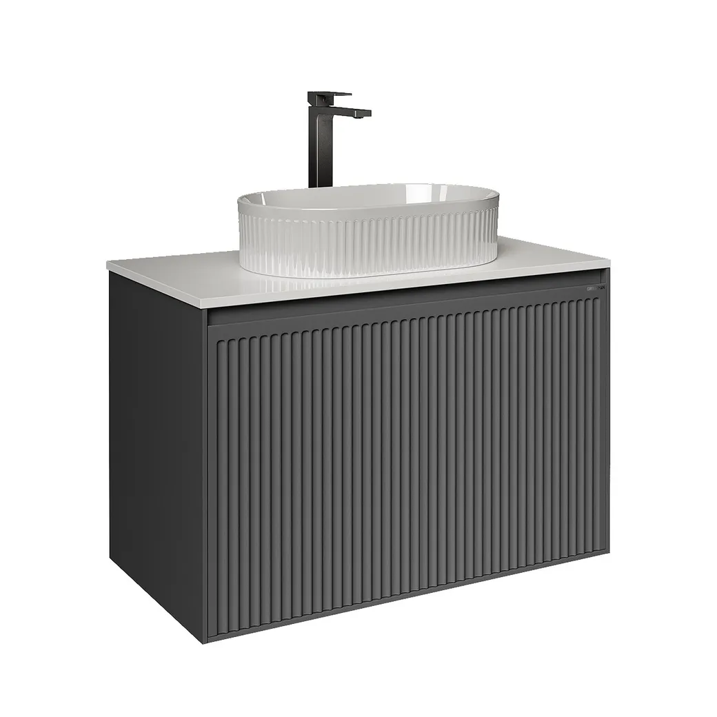 Подвесная тумба “КРИСТАЛЛ” 80 см с 1 ящиком, графит матовая — стильное и функциональное решение для современной ванной комнаты. Корпус и фасады выполнены из прочного МДФ, окрашенного в цвет графит с матовым эффектом. Элегантный фасад с вертикальным рифлением придаёт изделию изысканный внешний вид. Безручечный дизайн и скрытые направляющие с доводчиком обеспечивают комфортное и бесшумное использование. Тумба предназначена для настенного монтажа, в комплект входят надёжные подвесы для крепления. Столешница “КРИСТАЛЛ-80 см” из искусственного камня приобретается отдельно.