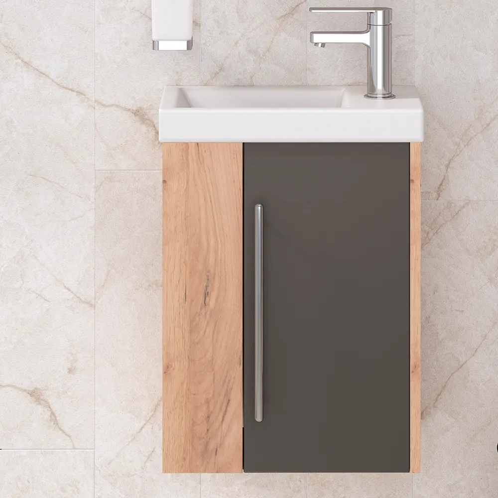 Коллекцию мебели для ванных MELBOURNE отличает оригинальность, функциональность и минимализм. Характерные особенности серии: простые строгие линии, отсутствие лишних элементов и хромированная рейлинговая ручка, которая эффектно подчеркивает элегантность и лаконичность каждой детали. Модели сочетают в себе две текстуры: корпус выполнен из влагостойкого ЛДСП "Дуб Крафт золотой", выгодно подчеркнутым фасадами из МДФ в серой матовой пленке. Коллекция выпускается в четырех размерах: 40,60,80 и 100см. Тумба MELBOURNE 40 см /дуб/серый/ подвесная с 1 распашной дверкой. Комплектуется фаянсовой раковиной Como 40см ТМ Cersanit. Петли со встроенным доводчиком. Выпускается только в правом исполнении.