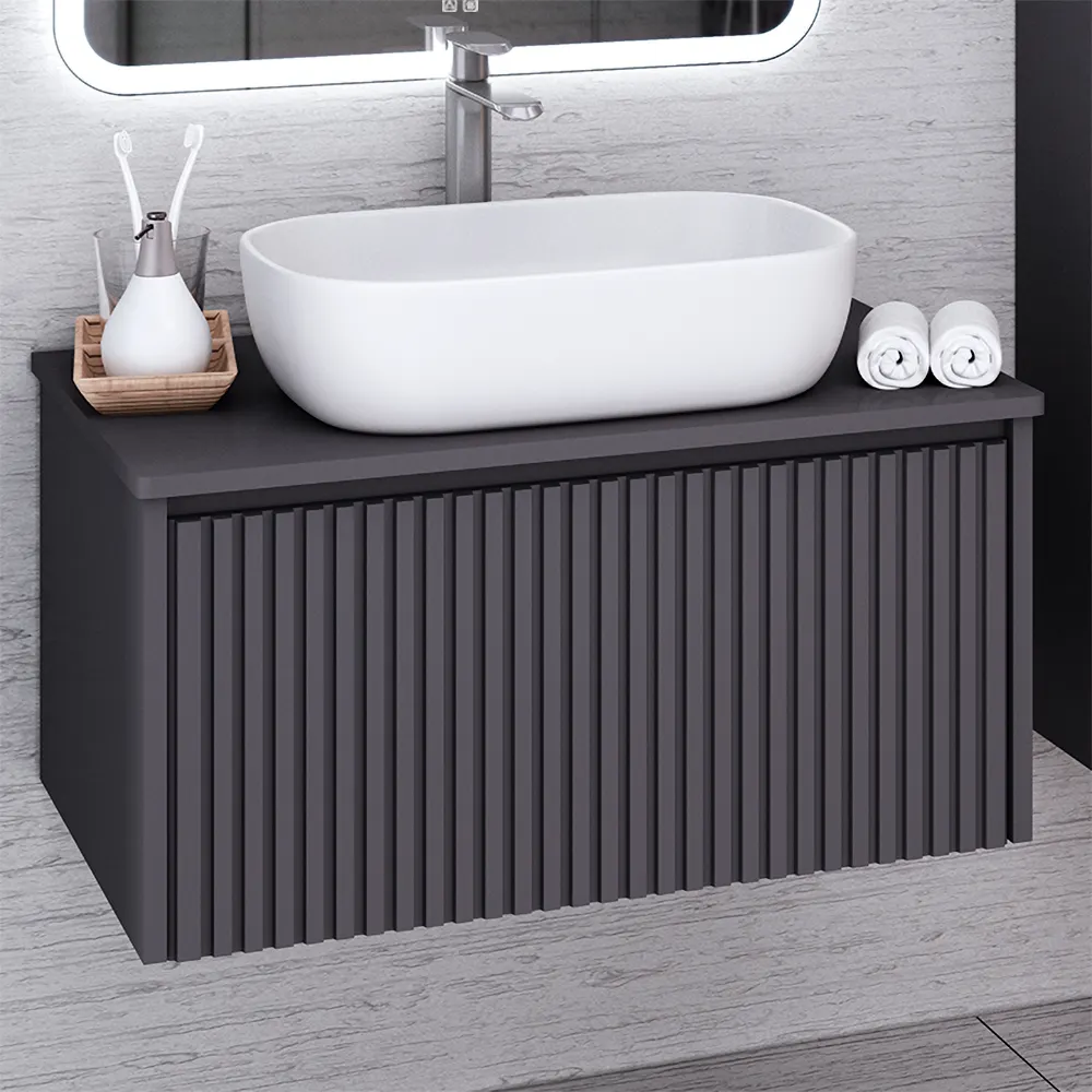 Новая коллекция MONACO гармонично впишется как в классический, так и минималистический стиль. Акцентной деталью данной серии является рифленый фасад, который придает внешнему виду мебели глубины и ритмичности, а также оказывает завораживающие и умиротворяющее действие. Объемный рисунок на фронтальной части зрительно вытягивает помещение и делает интерьер ванной комнаты более фактурным, динамичным и самобытным. Коллекция выпускается в трех трендовых цветах: белый софт, аквамарин и графит. Покрытие в пленке ПВХ с эффектом Soft Thach – гладкое и матовое по внешнему виду, мягкое и бархатное на ощупь, сегодня очень популярно среди дизайнеров. Благодаря универсальному отверстию на столешнице тумба может комплектоваться различными вариантами накладных раковин всевозможных форм, цветов и размеров. Дополнить комплект тумбы с раковиной и шкаф-пенала можно зеркалом с LED-подсветкой из нашего большого ассортимента ТМ Aqua de Marco. Фасад ящика на подвесной тумбе MONACO 70см /графит/ открывается с помощью механизма Push-to-open. Выдвижной ящик изготовлен из ЛДСП дуб Крафт белый (Кроношпан) толщиной 1см и оснащен направляющими скрытого монтажа, благодаря чему смотрится легко и стильно.