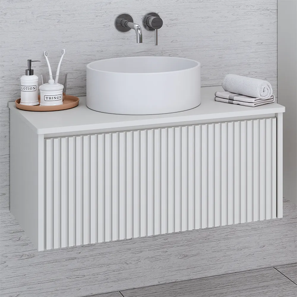 Новая коллекция MONACO гармонично впишется как в классический, так и минималистический стиль. Акцентной деталью данной серии является рифленый фасад, который придает внешнему виду мебели глубины и ритмичности, а также оказывает завораживающие и умиротворяющее действие. Объемный рисунок на фронтальной части зрительно вытягивает помещение и делает интерьер ванной комнаты более фактурным, динамичным и самобытным. Коллекция выпускается в трех трендовых цветах: белый софт, аквамарин и графит. Покрытие в пленке ПВХ с эффектом Soft Thach – гладкое и матовое по внешнему виду, мягкое и бархатное на ощупь, сегодня очень популярно среди дизайнеров. Благодаря универсальному отверстию на столешнице тумба может комплектоваться различными вариантами накладных раковин всевозможных форм, цветов и размеров. Дополнить комплект тумбы с раковиной и шкаф-пенала можно зеркалом с LED-подсветкой из нашего большого ассортимента ТМ Aqua de Marco. Фасад ящика на подвесной тумбе MONACO 80см /белый софт/ открывается с помощью механизма Push-to-open. Выдвижной ящик изготовлен из ЛДСП дуб Крафт белый (Кроношпан) толщиной 1см и оснащен направляющими скрытого монтажа, благодаря чему смотрится легко и стильно.