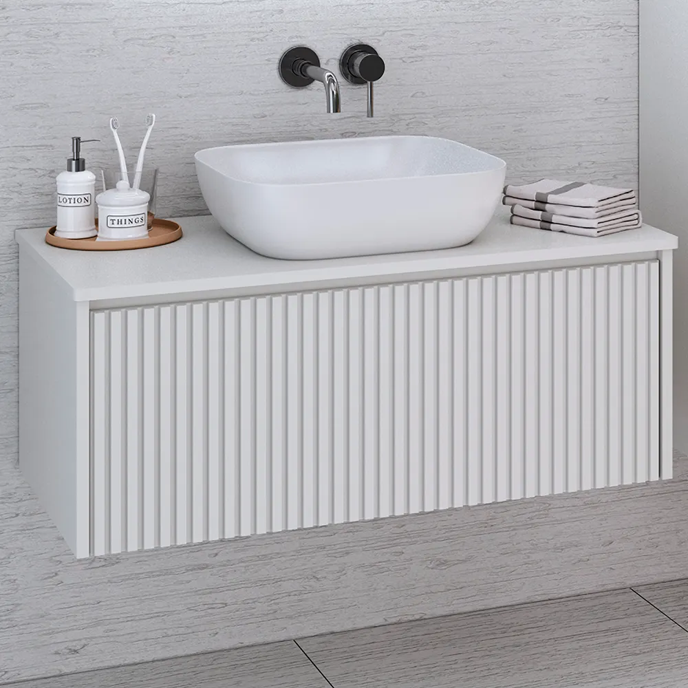 Новая коллекция MONACO гармонично впишется как в классический, так и минималистический стиль. Акцентной деталью данной серии является рифленый фасад, который придает внешнему виду мебели глубины и ритмичности, а также оказывает завораживающие и умиротворяющее действие. Объемный рисунок на фронтальной части зрительно вытягивает помещение и делает интерьер ванной комнаты более фактурным, динамичным и самобытным. Коллекция выпускается в трех трендовых цветах: белый софт, аквамарин и графит. Покрытие в пленке ПВХ с эффектом Soft Thach – гладкое и матовое по внешнему виду, мягкое и бархатное на ощупь, сегодня очень популярно среди дизайнеров. Благодаря универсальному отверстию на столешнице тумба может комплектоваться различными вариантами накладных раковин всевозможных форм, цветов и размеров. Дополнить комплект тумбы с раковиной и шкаф-пенала можно зеркалом с LED-подсветкой из нашего большого ассортимента ТМ Aqua de Marco. Фасад ящика на подвесной тумбе MONACO 90см /белый софт/ открывается с помощью механизма Push-to-open. Выдвижной ящик изготовлен из ЛДСП дуб Крафт белый (Кроношпан) толщиной 1см и оснащен направляющими скрытого монтажа, благодаря чему смотрится легко и стильно.