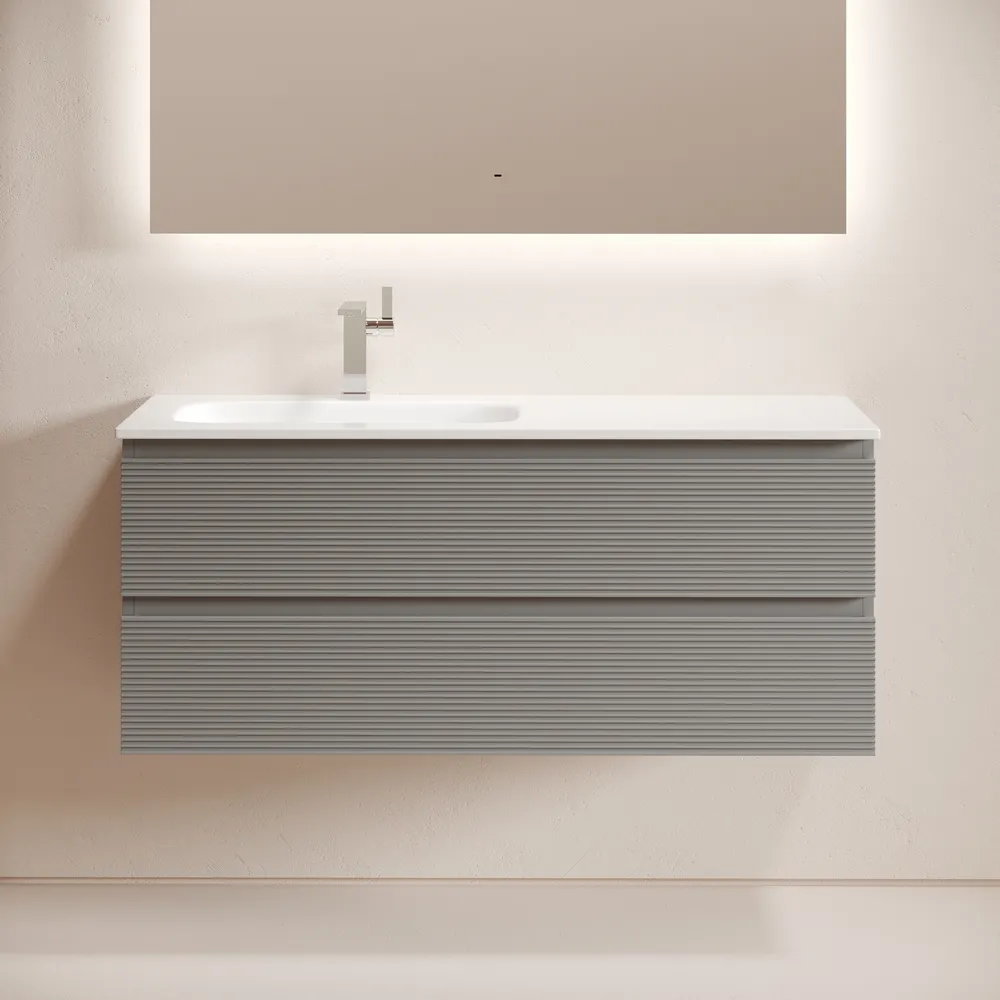 Тумба подвесная с рельефным фасадом SANCOS Folk левая 1195х445х500, c двумя ящиками оснащенными доводчиками скрытого монтажа с системой плавного закрывания, цвет Ergraut soft, арт.FL120LES
