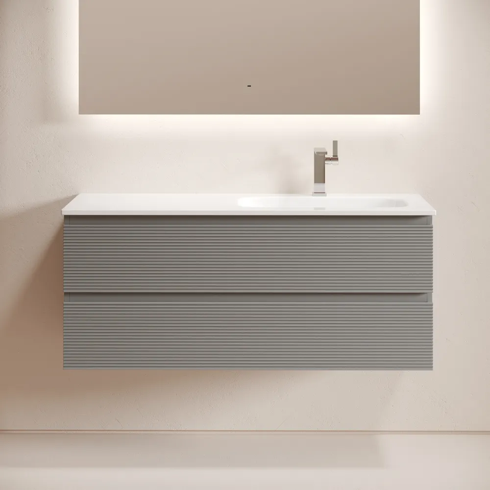 Тумба подвесная с рельефным фасадом SANCOS Folk правая 1195х445х500, c двумя ящиками оснащенными доводчиками скрытого монтажа с системой плавного закрывания, цвет Ergraut soft, арт.FL120RES