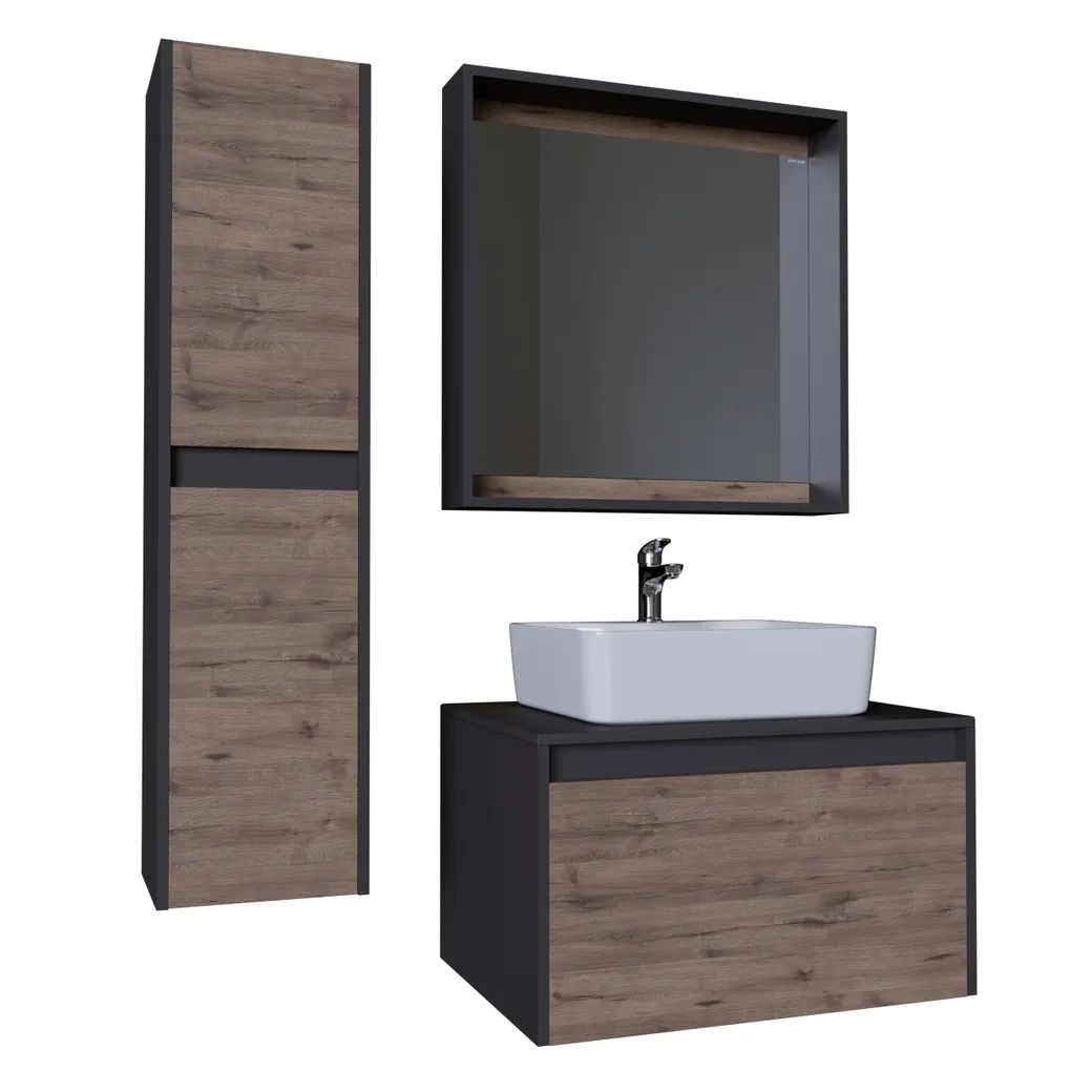 Тумба подвесная Смарт-70 см Компактная тумба имеет два вместительных выдвижных ящика - основной с системой организации пространства и второй - скрытый, установленный непосредственно под раковиной и предназначенный для мелких предметов. Ящики комплектуются направляющими скрытого монтажа. Органайзер с системой открывания «Push to open» делают мебель удобной и практичной в эксплуатации. Корпус и фасады тумбы выполнены из влагостойких материалов, устойчивого к перепадам температуры и высокой влажности, крепится к стене и не занимает место на полу. Корпус: ЛДСП графит; фасады: ЛДСП веллингтон. Подвесы для крепления тумбы - в комплекте.