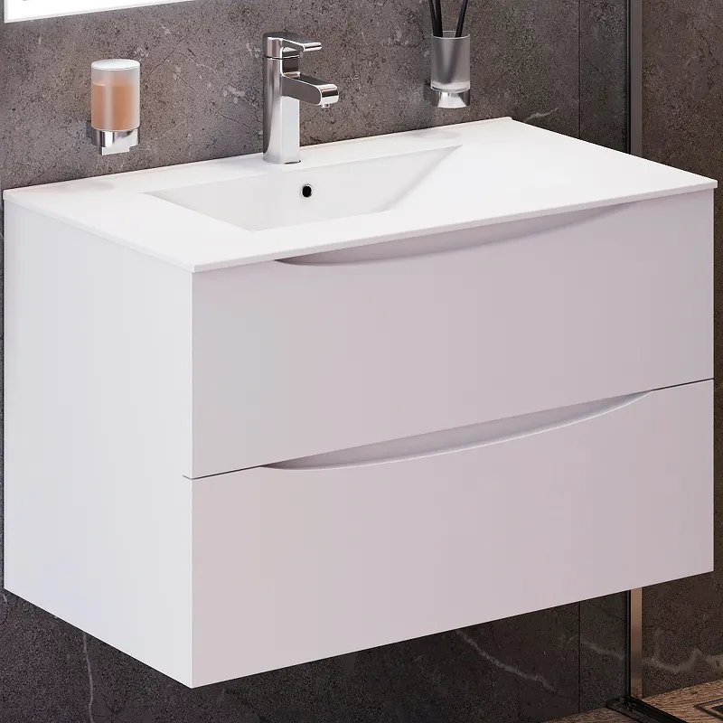 - Элегантный дизайн: Белая матовая поверхность и интегрированные ручки подчёркивают современный стиль мебели для ванной комнаты.