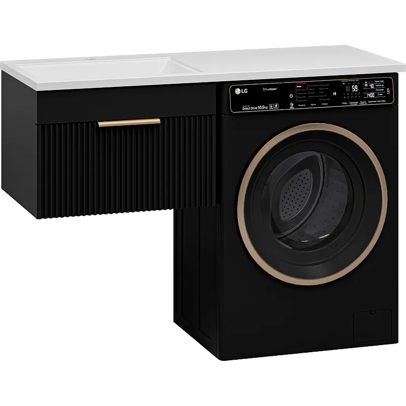 - Эстетичный дизайн: Черная матовая тумба с фурнитурой золотого цвета создает изысканный контраст, который украсит любую ванную комнату.