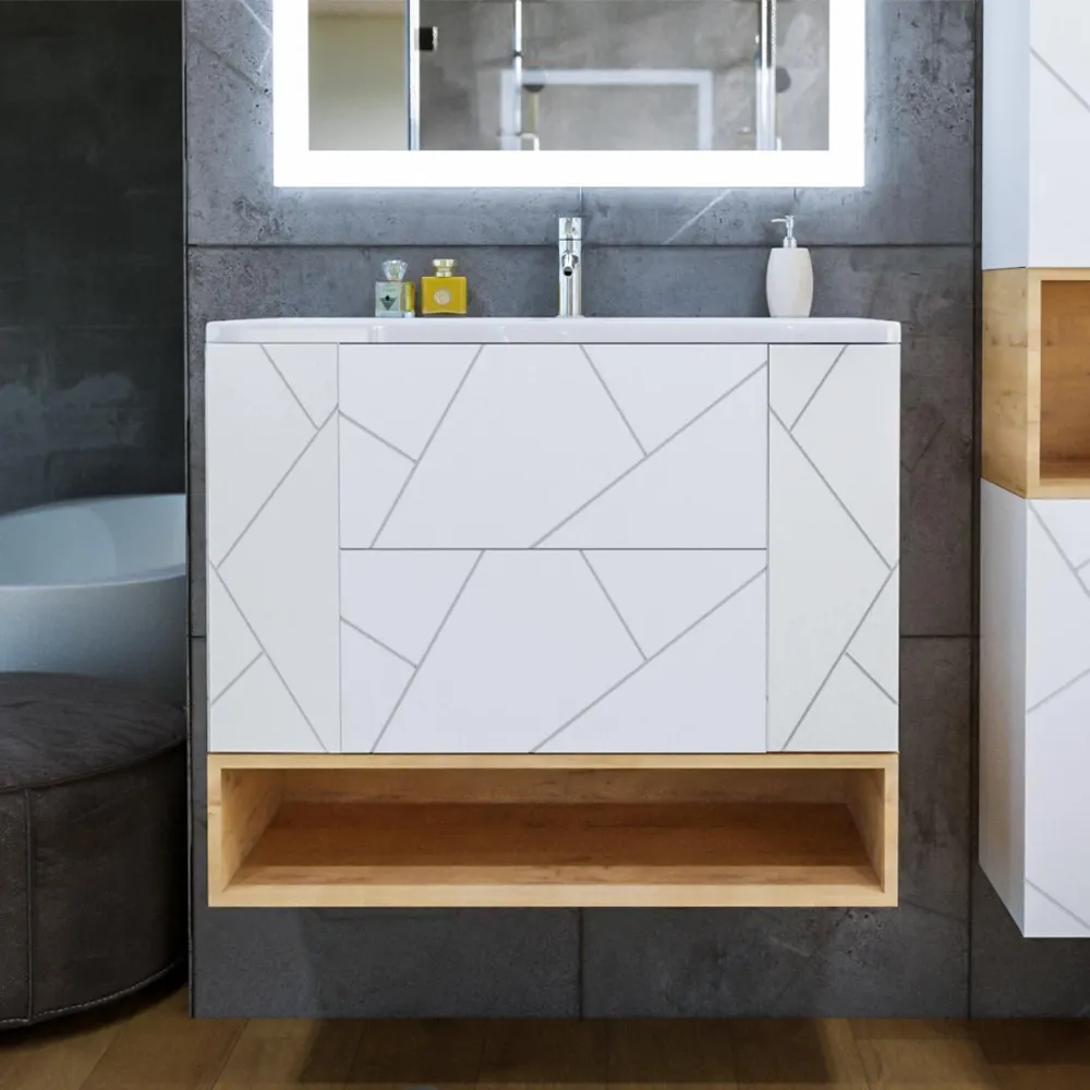 Комплект мебели Бриклаер КРИСТАЛЛ состоит из: Тумба под раковину подвесная Бриклаер КРИСТАЛЛ белый, 90 см, Раковина Paola Alba 900, белый, Ниша для тумбы Бриклаер КРИСТАЛЛ 90 см, дуб бунратти.