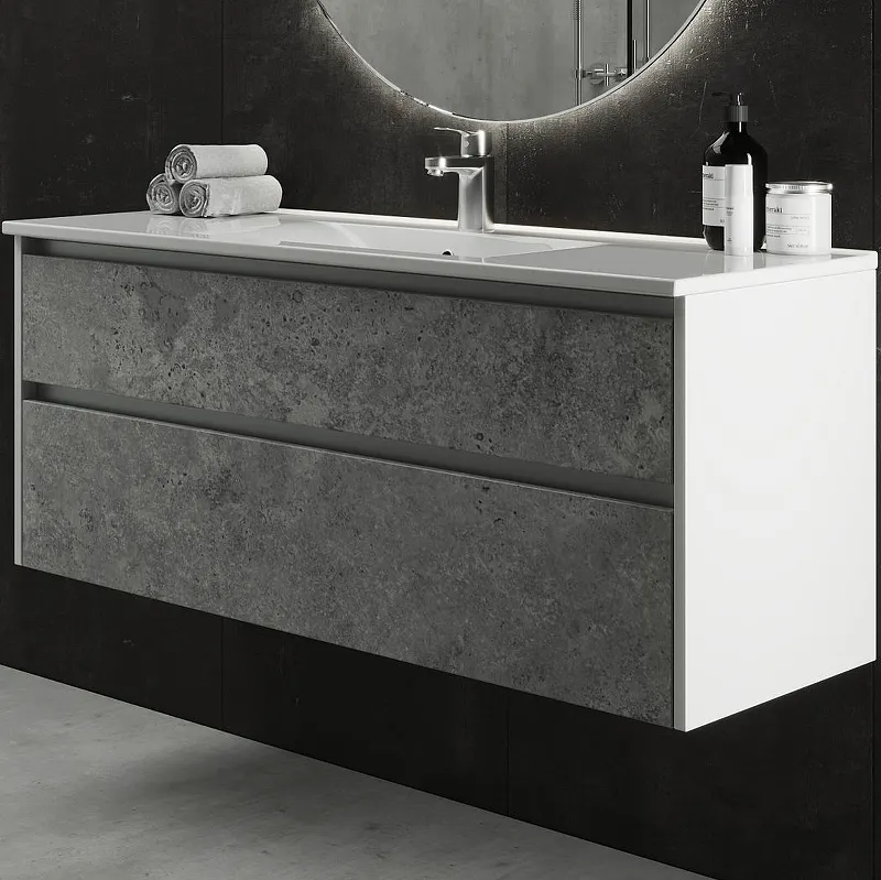 - Эстетичный внешний вид: Поверхность тумбы представлена в цвете бетон урбан грей и белом глянце, что добавляет элегантности.