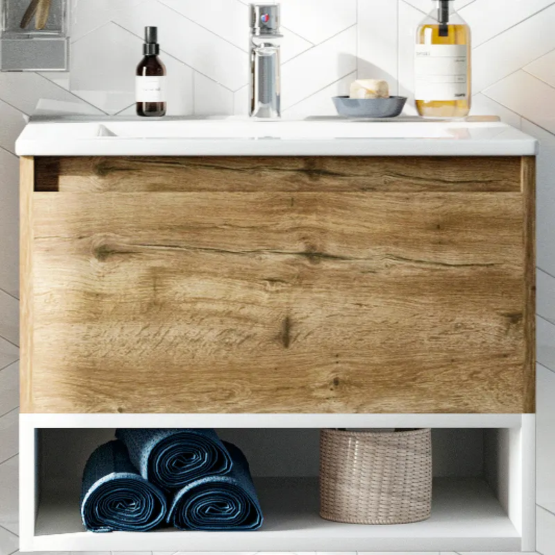 - Эффективная система хранения: Тумба оснащена ящиками и открытыми полками, что позволяет оптимально организовать пространство в ванной комнате.