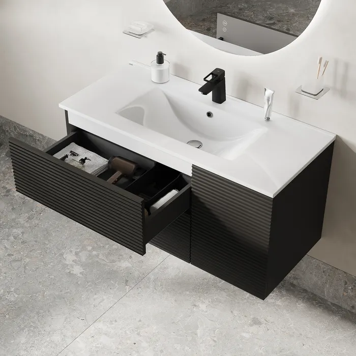 Вместительная подвесная тумба для ванной комнаты Bild с умывальником и выдвижными ящиками и полками – красивый дизайн с трендовой горизонтальной фрезеровкой в сочетании с популярным темно-серым цветом, удобством и практичностью. Материал фасадов – МДФ с покрытием ПВХ-пленкой. Она разработана для использования в помещениях с высокой влажностью и сохранит первоначальный вид мебели надолго (при должном уходе). Материал боковин – МДФ. Керамический умывальник с высоким бортом и большой вместительной чашей в комплекте. Удобен для гигиенических и хозяйственных нужд. Два ящика с направляющими скрытого монтажа с доводчиком Hettich и полки с распашной дверкой. Фурнитура рассчитана на более 10 лет исправной работы. Современный механизм открытия Push-to-Open – открывается нажатием на фасад. В комплекте крепеж для монтажа тумбы. Сифон приобретается отдельно. Гарантия на мебель IDDIS® – 3 года, на умывальник – 5 лет. (с) Авторский текст, март 2025 г.
