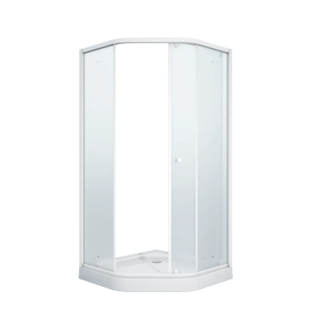 Уголок из матового стекла и белого алюминиевого профиля лаконично впишется практически в любое оформление ванной комнаты. Трапециевидная форма и раздвижные двери экономят полезную площадь в санузле Модель практична. На матовом стекле не видны разводы от воды, полотно легко чистить.