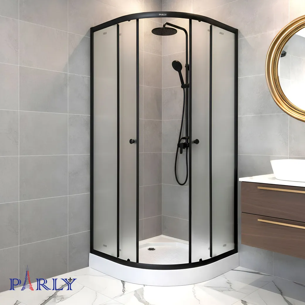 Уголок ZF911B душевой PARLY с поддоном (90х90х190) Размер: 90х90х190 см Сочетание черного профиля и матового стекла отлично впишется в современную ванную комнату. Уголок полукруглой формы с раздвижными дверями экономит полезную площадь в санузле. Достоинства: Травмобезопасное закаленное стекло 4 мм: в случае битья полотно рассыпается на гранулы, о которые невозможно порезаться. Низкий поддон (10 см) легко переступать. Рельефное дно предупреждает падения. Одинарные нажимные ролики обеспечивают плавный ход створок. Двери смыкаются плотно, вода наружу не просачивается. В комплекте – сифон. Внимание! Производитель оставляет за собой право вносить изменения в конструкцию и комплектацию моделей без предварительного уведомления!