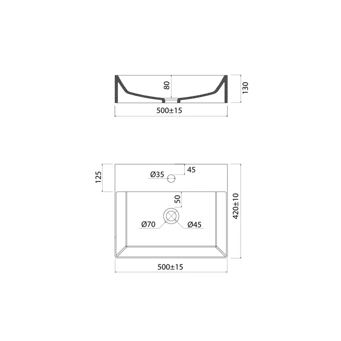 Стильный умывальник Bild для ванной комнаты актуального лаконичного дизайна с удобной полочкой подойдёт к любому современному интерьеру. Размер 500х420х130 мм. Два варианта установки: подвесной и настольный.