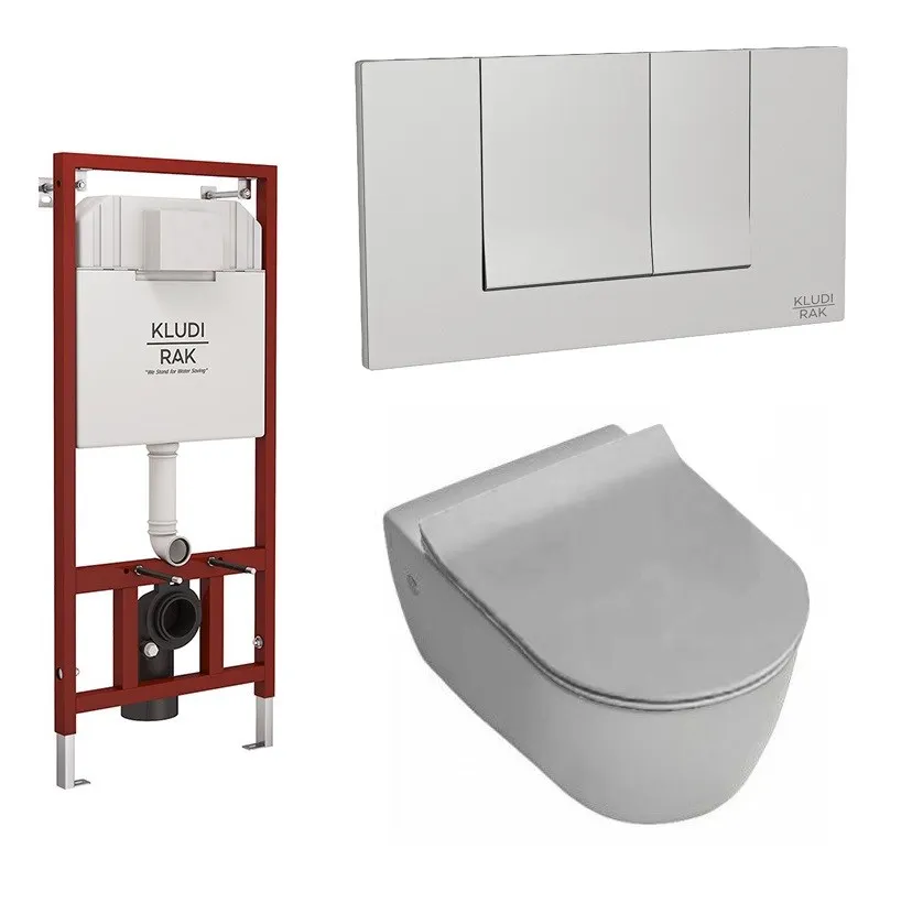 Унитаз HATRIA Fusion подвесной комплект с cиденьем с крышкой с плавным опусканием безободковый цвет белый с инсталляцией для унитаза и кнопка хром KLUDI RAK арт-HKF001