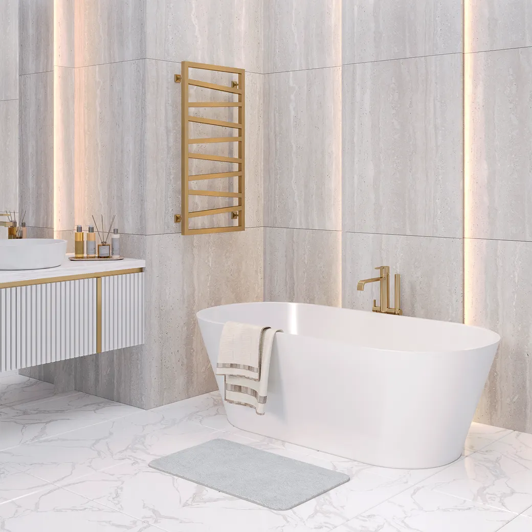Ванна из литьевого мрамора CORSICA, благодаря своей овальной форме, придется по вкусу любителям гармонии и тонких форм. Лаконичные линии овала мягко дополняют интерьер, даря ему спокойствие и равновесие. Отсутствие острых углов делает овальную ванну самой безопасной находкой, которая вместе с тем не занимает много места. Отдельно стоящая ванна размещается в центре ванной комнаты или на небольшом расстоянии от стены. К ней может быть подключен напольный смеситель или обычная система, выступающая из стены.