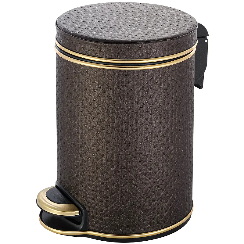 Ведро для мусора Geralis V-PCG-B Punto с педалью.Характеристики: Цвет: шоколад. Кант: золото. Материал: экокожа, ABS-пластик, металл. Габариты (ШхВхД): 210х290х260 мм. Объем: 5 л. Плавное закрывание крышки. Внутри мусорного ведра, съемное пластиковое ведро с ручкой. Надежный педальный механизм открытия крышки. Монтаж: напольный.