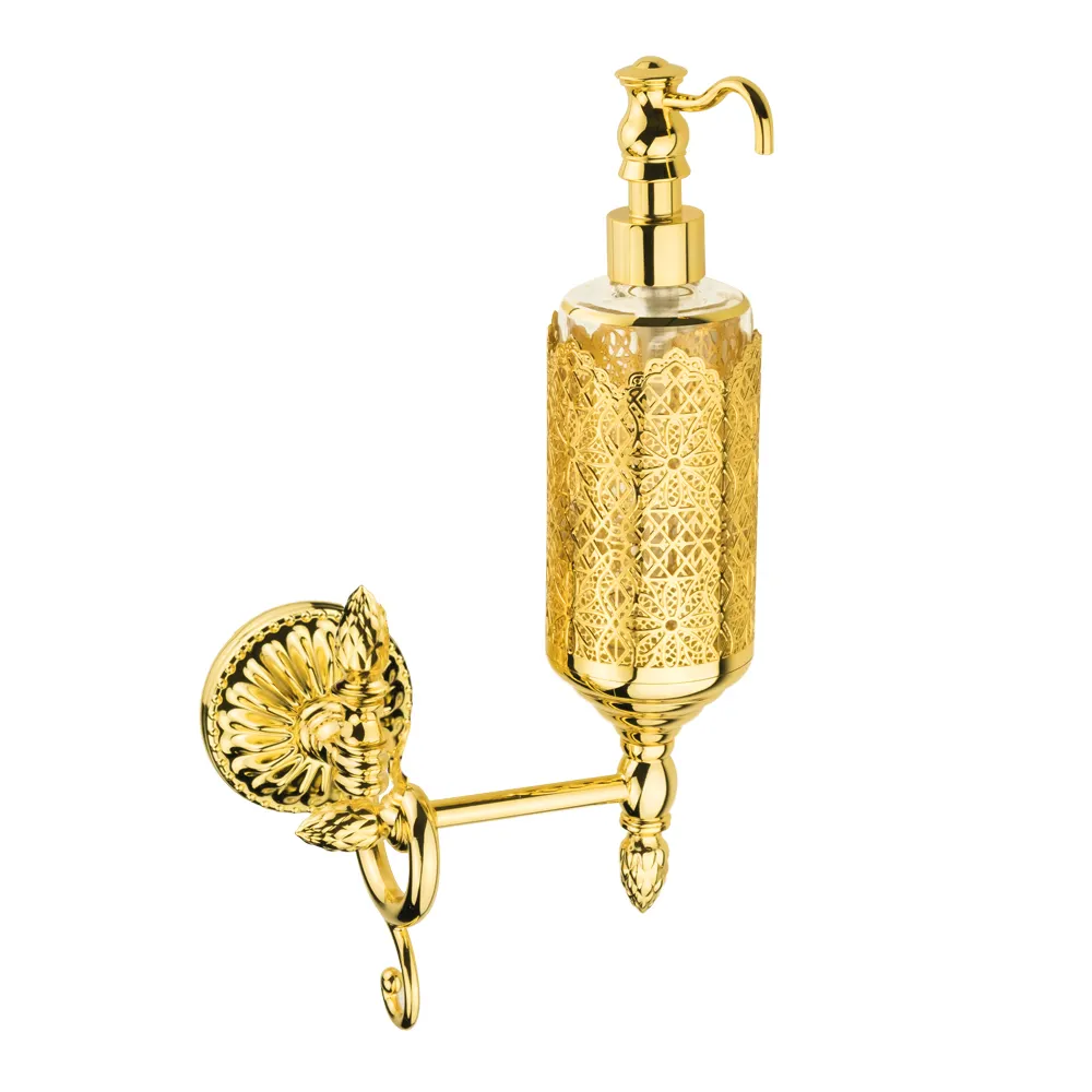 Настенный дозатор жидкого мыла коллекции VERSAILLES бренда MIGLIORE выполнен из латуни и высококачественного хрусталя, декорированного золотом 24 кт. При необходимости хрустальный дозатор можно вынуть из посадочного места, чтобы помыть. Изделие выполнено из высококачественной латуни и имеет гальваническое покрытие золотом 24 карата.