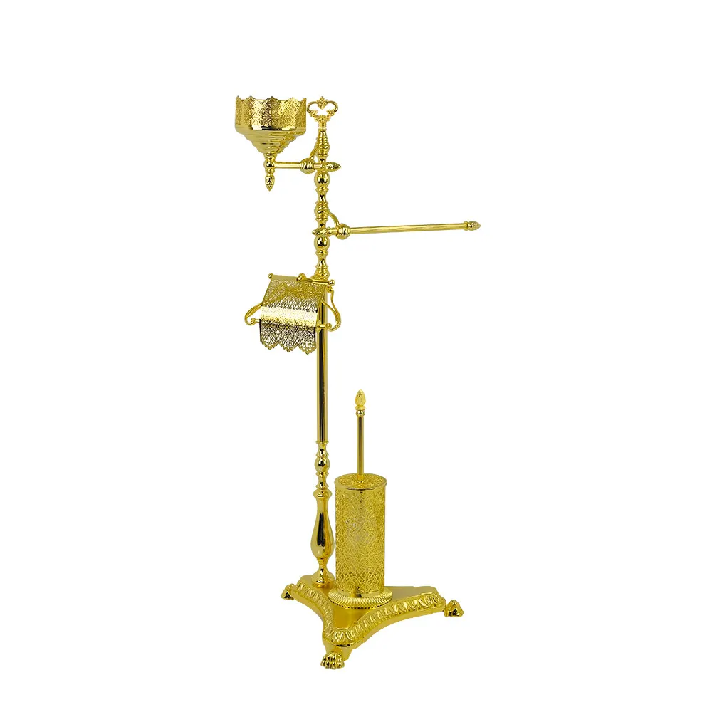 Стойка для унитаза и биде коллекции VERSAILLES бренда MIGLIORE — это красивый и многофункциональный аксессуар для ванной комнаты. На стойке расположены стеклянная мыльница с внешним ажурным обрамлением из латуни, полотенцедержатель, бумагодержатель с ажурной крышкой и латунный декорированный ерш, внутри которого вставлена стеклянная колба, которую легко вынуть, чтобы помыть. Изделие выполнено из высококачественной латуни и имеет гальваническое покрытие золотом 24 карата.