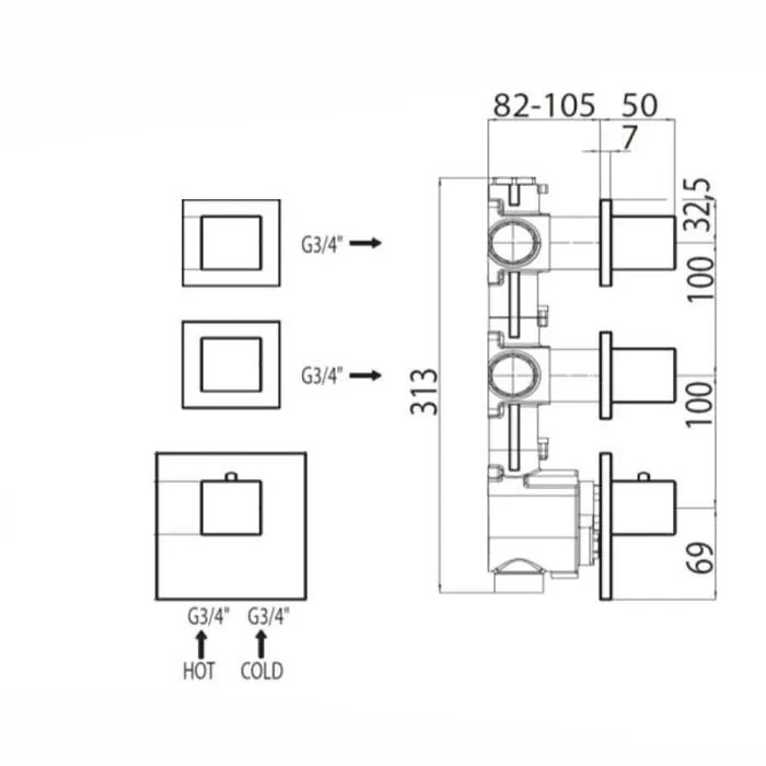 Встраиваемая часть Bossini Z030203000 для термостата для ванны и душа на 3 потребителя с переключателем на 3 выхода с 1 вентилем
