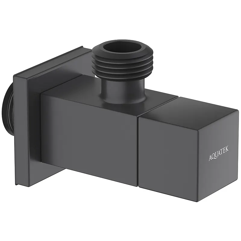 Запорный вентиль Aquatek AQ2453MB угловой.Характеристики: Цвет: черный матовый. Материал: латунь. Механизм: керамический картридж. Управление: рычажное. Размер розетки: 42x42 мм. Подключение: 1/2. Монтаж: на стену. В комплекте поставки: Запорный вентиль.