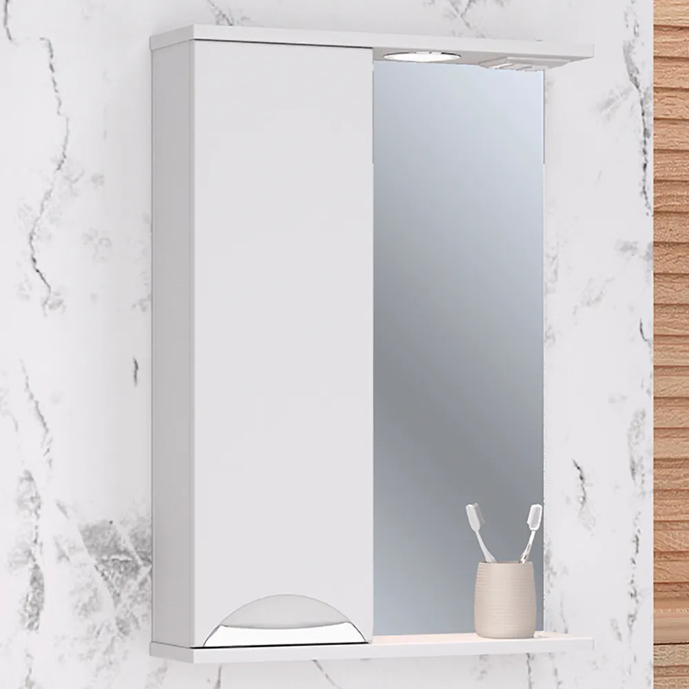 Коллекция мебели ELEGANSE - для тех кто ценит комфорт и практичность. Серия выполнена в минималистическом стиле, поэтому не будет перегружать пространство и перетягивать на себя внимание. А благодаря деликатному акценту в виде хромированной или позолоченной врезной ручки мебель точно не будут смотреться скучно. Предметы из коллекций ELEGANSE выполнены в белом цвете и из высококачественных материалов, гарантирующих высокую износостойкость. Корпус и фасады покрыты полиакриловой эмалью бренда RENNER Italia, которая защищает мебель от воздействия влаги. Широкая размерная линейка комплектов (от 50 до 105см) дополняется универсальными навесными шкафчиками и пеналами. Зеркальный шкаф ELEGANSE 50 со шкафчиком слева оснащен одним врезным светодиодным светильником 220В и блоком розетка/выключатель. Зеркало не боится влаги и не мутнеет со временем. Дверца на петлях с доводчиками закрывается плавно и мягко.