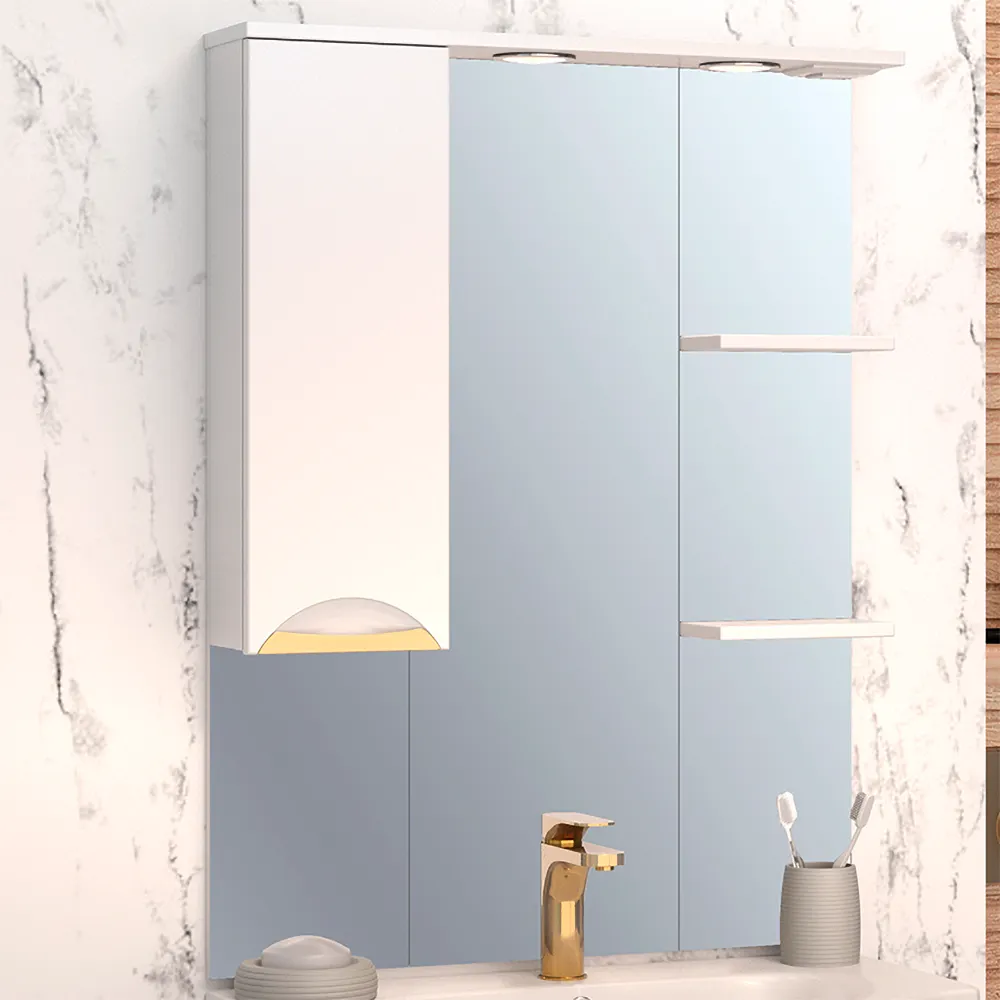 Коллекция мебели ELEGANSE - для тех кто ценит комфорт и практичность. Серия выполнена в минималистическом стиле, поэтому не будет перегружать пространство и перетягивать на себя внимание. А благодаря деликатному акценту в виде хромированной или позолоченной врезной ручки мебель точно не будет смотреться скучно. Предметы из коллекций ELEGANSE выполнены в белом цвете и из высококачественных материалов, гарантирующих высокую износостойкость. Корпус и фасады покрыты полиакриловой эмалью бренда RENNER Italia, которая защищает мебель от воздействия влаги. Широкая размерная линейка комплектов (от 50 до 105см) дополняется универсальными навесными шкафчиками и пеналами. Зеркальный шкаф ELEGANSE 75 со шкафчиком слева оснащен двумя врезными светодиодными светильниками 220В и блоком розетка/выключатель. Зеркало высотой 100см визуально расширяет пространство в ванной, а шкафчик с полками создают порядок и уют. Дверца на петлях с доводчиками закрывается плавно и мягко.