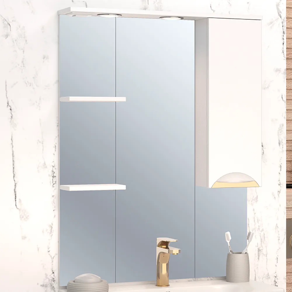 Коллекция мебели ELEGANSE - для тех кто ценит комфорт и практичность. Серия выполнена в минималистическом стиле, поэтому не будет перегружать пространство и перетягивать на себя внимание. А благодаря деликатному акценту в виде хромированной или позолоченной врезной ручки мебель точно не будет смотреться скучно. Предметы из коллекций ELEGANSE выполнены в белом цвете и из высококачественных материалов, гарантирующих высокую износостойкость. Корпус и фасады покрыты полиакриловой эмалью бренда RENNER Italia, которая защищает мебель от воздействия влаги. Широкая размерная линейка комплектов (от 50 до 105см) дополняется универсальными навесными шкафчиками и пеналами. Зеркальный шкаф ELEGANSE 75 со шкафчиком справа оснащен двумя врезными светодиодными светильниками 220В и блоком розетка/выключатель. Зеркало высотой 100см визуально расширяет пространство в ванной, а шкафчик с полками создают порядок и уют. Дверца на петлях с доводчиками закрывается плавно и мягко.
