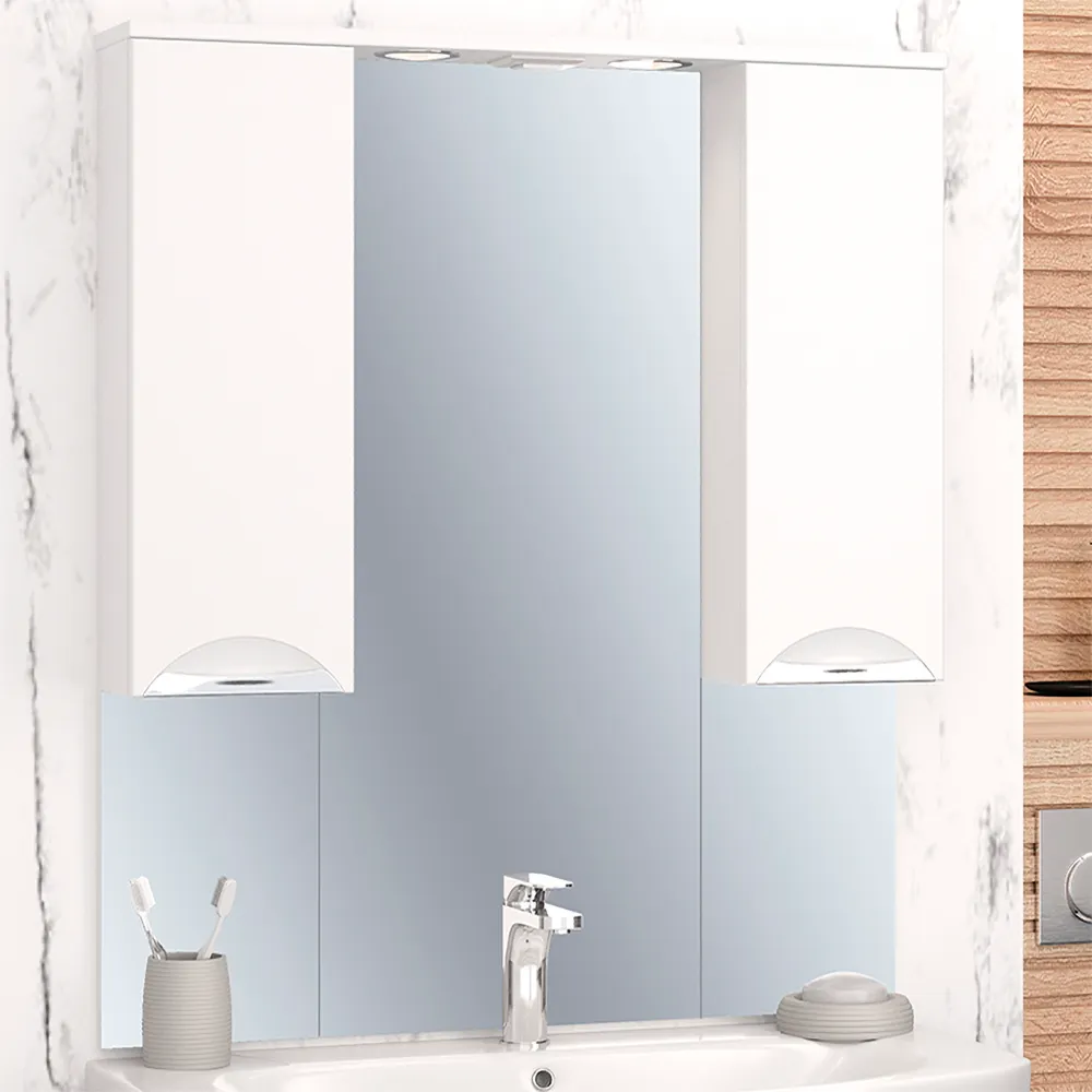 Коллекция мебели ELEGANSE - для тех кто ценит комфорт и практичность. Серия выполнена в минималистическом стиле, поэтому не будет перегружать пространство и перетягивать на себя внимание. А благодаря деликатному акценту в виде хромированной или позолоченной врезной ручки мебель точно не будут смотреться скучно. Предметы из коллекций ELEGANSE выполнены в белом цвете и из высококачественных материалов, гарантирующих высокую износостойкость. Корпус и фасады покрыты полиакриловой эмалью бренда RENNER Italia, которая защищает мебель от воздействия влаги. Широкая размерная линейка комплектов (от 50 до 105см) дополняется универсальными навесными шкафчиками и пеналами. Зеркальный шкаф ELEGANSE 85 с двумя шкафчиками слева/справа оснащен двумя врезными светодиодными светильниками 220В и блоком розетка/выключатель. Зеркало высотой 100см визуально расширяет пространство в ванной, а шкафчики с полками создают порядок и уют. Дверцы на петлях с доводчиками закрываются плавно и мягко.
