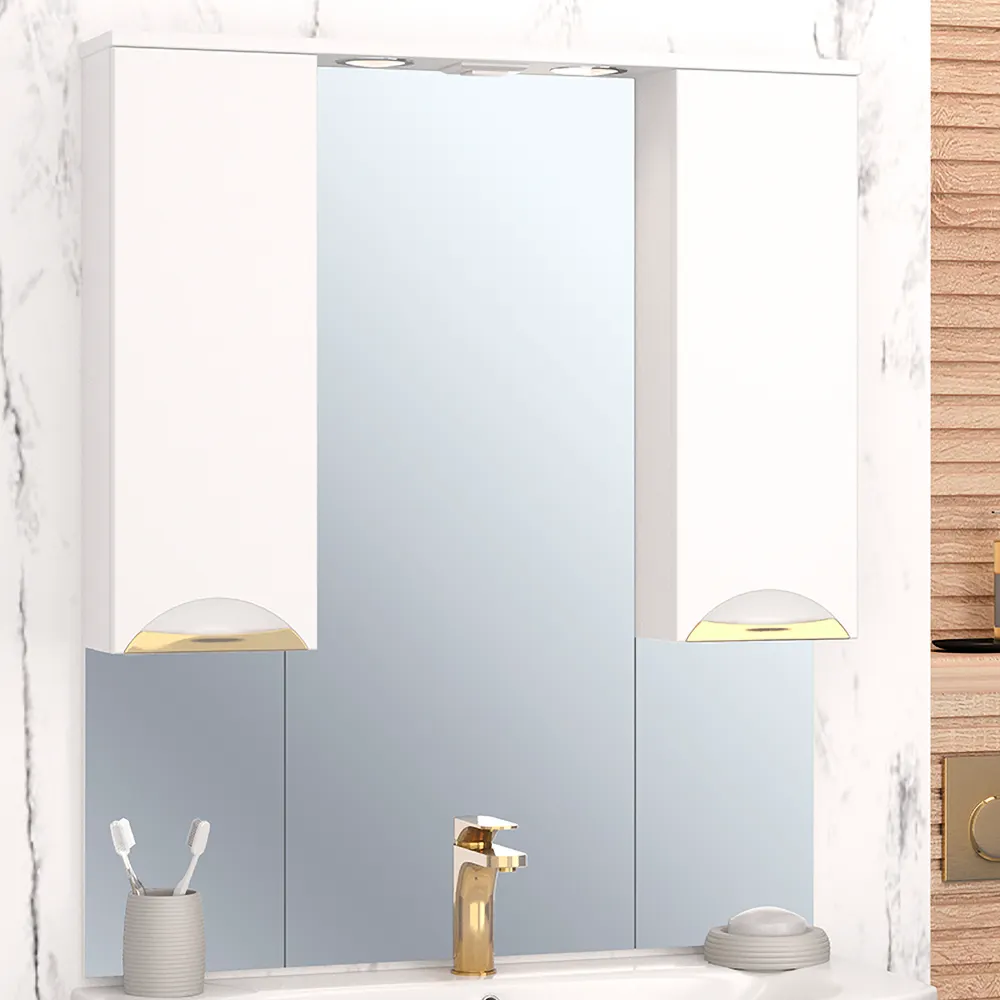 Коллекция мебели ELEGANSE - для тех кто ценит комфорт и практичность. Серия выполнена в минималистическом стиле, поэтому не будет перегружать пространство и перетягивать на себя внимание. А благодаря деликатному акценту в виде хромированной или позолоченной врезной ручки Мебель точно не будет смотреться скучно. Предметы из коллекций ELEGANSE выполнены в белом цвете и из высококачественных материалов, гарантирующих высокую износостойкость. Корпус и фасады покрыты полиакриловой эмалью бренда RENNER Italia, которая защищает мебель от воздействия влаги. Широкая размерная линейка комплектов (от 50 до 105см) дополняется универсальными навесными шкафчиками и пеналами. Зеркальный шкаф ELEGANSE 85 с двумя шкафчиками слева/справа оснащен двумя врезными светодиодными светильниками 220В и блоком розетка/выключатель. Зеркало высотой 100см визуально расширяет пространство в ванной, а шкафчики с полками создают порядок и уют. Дверцы на петлях с доводчиками закрываются плавно и мягко.