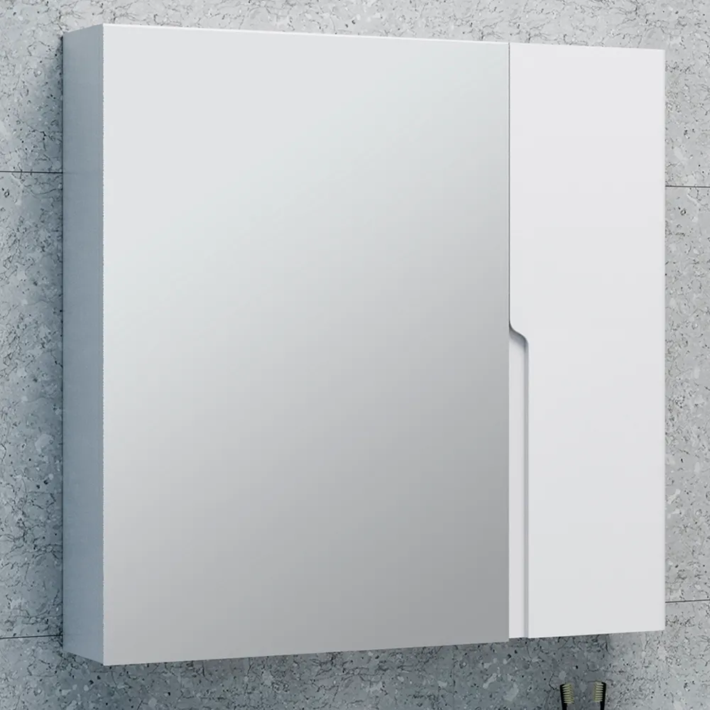 Коллекция мебели PALERMO практична, функциональна и отвечает всем требованиям современного дизайна. Плавные линии фасадов дополняет оригинальный вырез под ручку, который придает всей коллекции особую индивидуальность. Фасады и корпус мебели изготовлены из влагостойкого МДФ с лакокрасочным эмалевым покрытием, обладающим высокой устойчивостью к ультрафиолету, повышенной температуре и влажности. Зеркальный шкаф PALERMO 80см без подсветки, c двумя ассиметричными дверками и внутренними полками. Зеркальная дверка открывается с помощью механизма Push-To-Open. Петли со встроенным доводчиком.