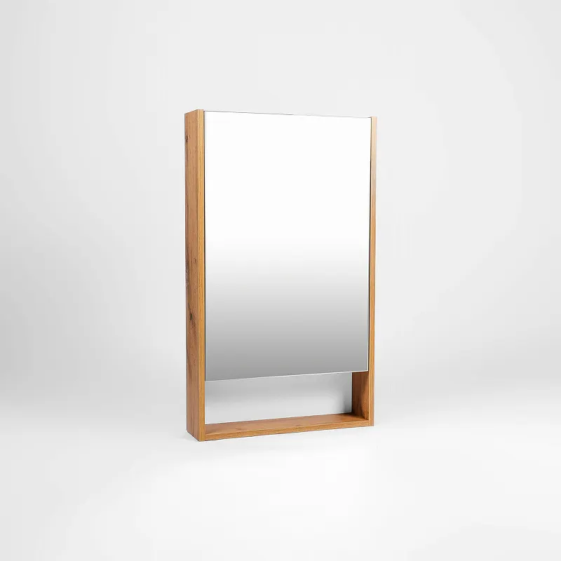 - Элегантный дизайн: Зеркальный шкаф с древесным узором создаёт уютную атмосферу в ванной комнате и подходит для современного стиля.
