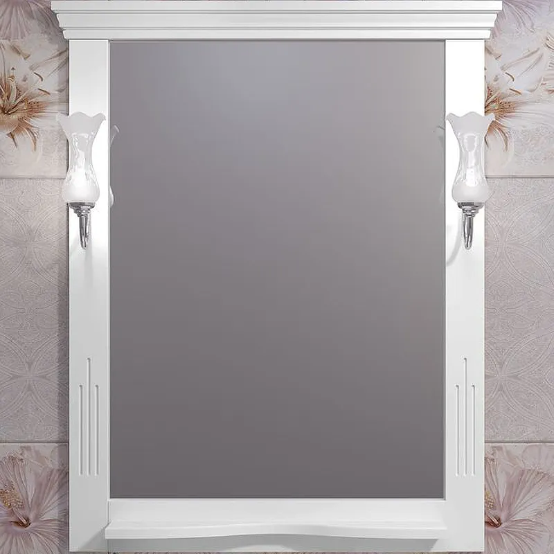 - Белое матовое зеркало с полкой: практичное решение для хранения мелочей.