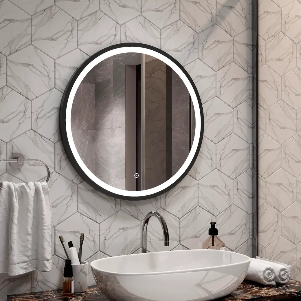 Зеркало Алиса для ванной комнаты с LED подсветкой и сенсорным выключателем, оснащенное диммером. Зеркало в черном обрамлении. Потребляемая мощность 26 W. Класс защиты IP44. В комплекте: блок питания, крепление зеркала (кронштейн с крюком), вилка, сетевой шнур.