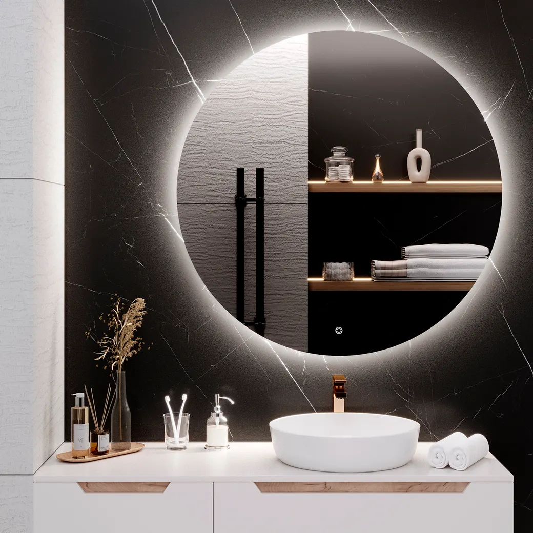 Зеркало с интегрированной LED-подсветкой MILAN обладает так называемым эффектом "парения", который очень оригинально смотрится в вечернее время при выключенном основном освещении в комнате. Полотно таких зеркал имеет размер, немного превышающий габариты корпуса. В сочетании с подсветкой такая конструкция при взгляде спереди создаёт ощущение, словно зеркало парит в воздухе в нескольких сантиметрах от стены. Ещё один плюс заключается в расположении подсветки, которая направлена из корпуса на стены. Если в помещении используется рельефная отделка стен или иная необычная фактура — "парящая" подсветка подчеркнёт и акцентирует на ней внимание. Сенсорный выключатель с диммированием управляется легким касанием кнопки, расположенной на поверхности зеркального полотна. Короткое касание менее 0,5с – включение или выключение освещения. Длительное касание более 0,5с - увеличение или уменьшение яркости освещения. Круглое зеркало MILAN диаметром 100см, светит ярко, но не раздражающе, и потребляет минимум электричества. Мощность 12В. Класс пылевлагозащиты IP-44. Зеркальное полотно ведущего европейского производителя AGC толщиной 4мм.