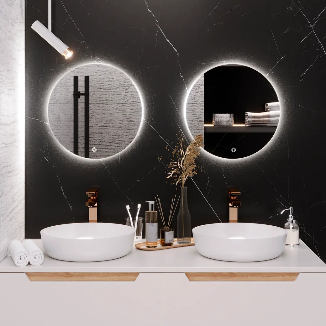Зеркало с интегрированной LED-подсветкой MILAN обладает так называемым эффектом "парения", который очень оригинально смотрится в вечернее время при выключенном основном освещении в комнате. Полотно таких зеркал имеет размер, немного превышающий габариты корпуса. В сочетании с подсветкой такая конструкция при взгляде спереди создаёт ощущение, словно зеркало парит в воздухе в нескольких сантиметрах от стены. Ещё один плюс заключается в расположении подсветки, которая направлена из корпуса на стены. Если в помещении используется рельефная отделка стен или иная необычная фактура — "парящая" подсветка подчеркнёт и акцентирует на ней внимание. Сенсорный выключатель с диммированием управляется легким касанием кнопки, расположенной на поверхности зеркального полотна. Короткое касание менее 0,5с – включение или выключение освещения. Длительное касание более 0,5с - увеличение или уменьшение яркости освещения. Круглое зеркало MILAN диаметром 40см, светит ярко, но не раздражающе, и потребляет минимум электричества. Мощность 12В. Класс пылевлагозащиты IP-44. Зеркальное полотно ведущего европейского производителя AGC толщиной 4мм.