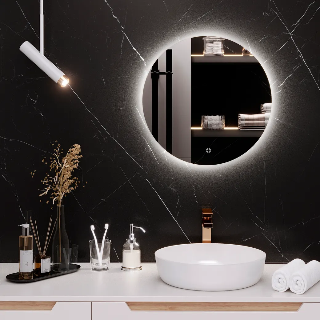 Зеркало с интегрированной LED-подсветкой MILAN обладает так называемым эффектом "парения", который очень оригинально смотрится в вечернее время при выключенном основном освещении в комнате. Полотно таких зеркал имеет размер, немного превышающий габариты корпуса. В сочетании с подсветкой такая конструкция при взгляде спереди создаёт ощущение, словно зеркало парит в воздухе в нескольких сантиметрах от стены. Ещё один плюс заключается в расположении подсветки, которая направлена из корпуса на стены. Если в помещении используется рельефная отделка стен или иная необычная фактура — "парящая" подсветка подчеркнёт и акцентирует на ней внимание. Сенсорный выключатель с диммированием управляется легким касанием кнопки, расположенной на поверхности зеркального полотна. Короткое касание менее 0,5с – включение или выключение освещения. Длительное касание более 0,5с - увеличение или уменьшение яркости освещения. Круглое зеркало MILAN диаметром 50см, светит ярко, но не раздражающе, и потребляет минимум электричества. Мощность 12В. Класс пылевлагозащиты IP-44. Зеркальное полотно ведущего европейского производителя AGC толщиной 4мм.