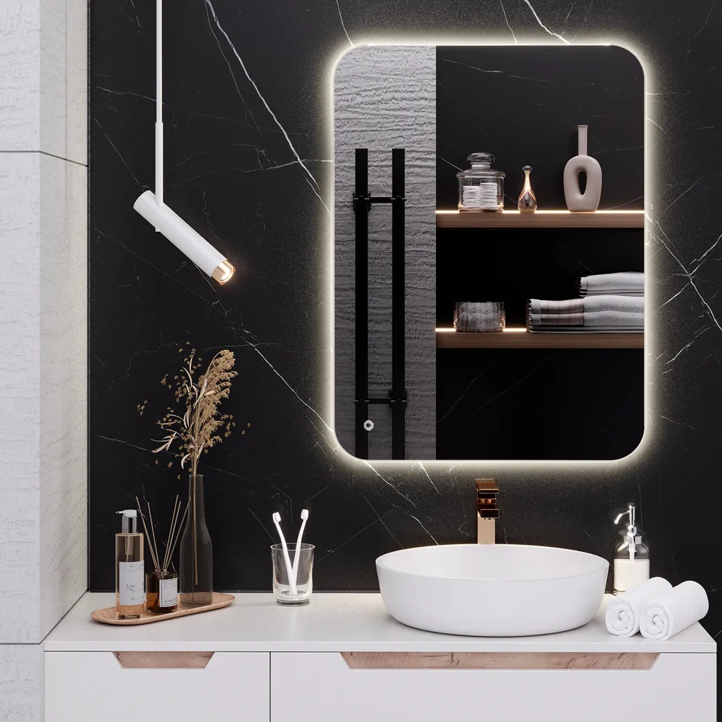 Зеркало с интегрированной LED-подсветкой MILAN обладает так называемым эффектом "парения", который очень оригинально смотрится в вечернее время при выключенном основном освещении в комнате. Полотно таких зеркал имеет размер, немного превышающий габариты корпуса. В сочетании с подсветкой такая конструкция при взгляде спереди создаёт ощущение, словно зеркало парит в воздухе в нескольких сантиметрах от стены. Ещё один плюс заключается в расположении подсветки, которая направлена из корпуса на стены. Если в помещении используется рельефная отделка стен или иная необычная фактура — "парящая" подсветка подчеркнёт и акцентирует на ней внимание. Зеркало MILAN - универсальное: при желании можно легко поменять его ориентацию с вертикальной (60*80см) на горизонтальную (80*60см) и наоборот. Кнопка сенсорного выключателя в вертикальном положении зеркала расположена в нижнем левом углу, а в горизонтальном - в правом углу. Сенсорный выключатель с диммированием управляется легким касанием кнопки, расположенной на поверхности зеркального полотна. Короткое касание менее 0,5с – включение или выключение освещения. Длительное касание более 0,5с - увеличение или уменьшение яркости освещения. Светодиодная подсветка по всему периметру светит ярко, но не раздражающе, и потребляет минимум электричества.