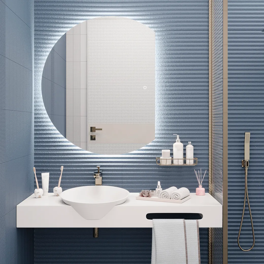 Полукруглое зеркало MOON – стильное и функциональное решение, которое подойдет под любой интерьер ванной комнаты, гостиной, прихожей, спальни. Оно гармонично сочетается с мебелью и элементами декора, не нарушая общий дизайн помещения. Оригинальная форма зеркала придает интерьеру изысканность и современный стиль, а благодаря отсутствию рамки, создается "парящий" эффект, который визуально расширяет пространство. Зеркало MOON универсальное, его можно повесить в трех положениях: со срезом слева, справа и снизу. Технические характеристики и комплектация: