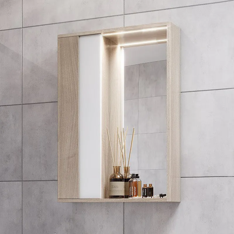 - Функциональность: Оснащение зеркала включает светодиодную подсветку, полку и шкаф, обеспечивающие удобство и комфорт в использовании.