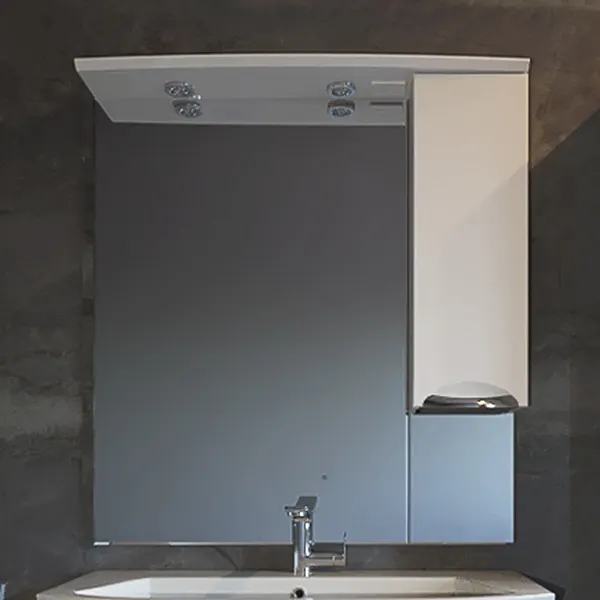 - Оснащение зеркала со шкафом и подсветкой обеспечивает максимальное удобство использования. Встроенные в карниз светильники мощностью 20 Вт создают идеальное освещение для ежедневных процедур.